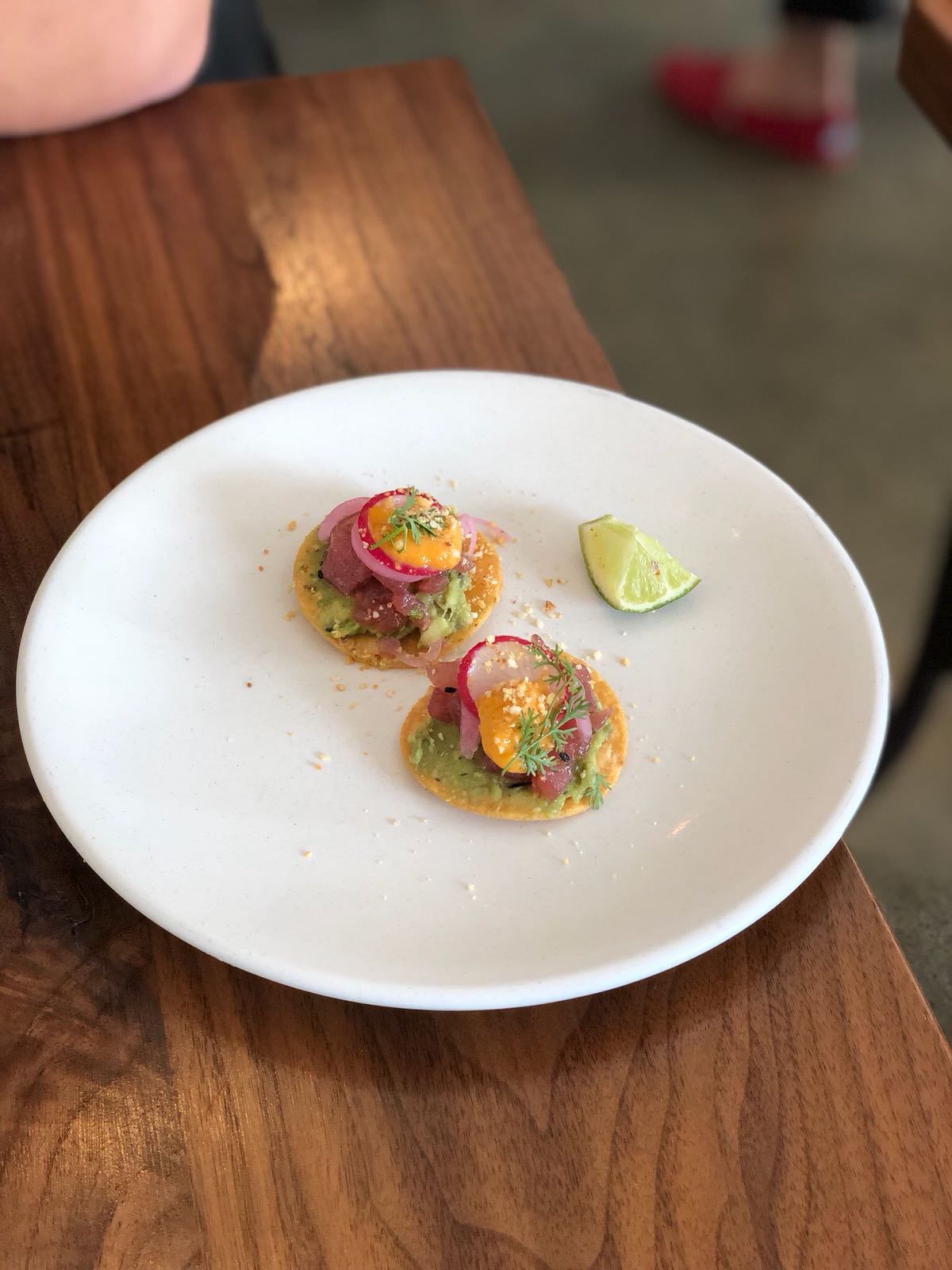There’s no better way to describe this dish than it tastes like “California.” It’s amazingly fresh with a touch of sourness from the pickles, served on a light but crunchy tostada.